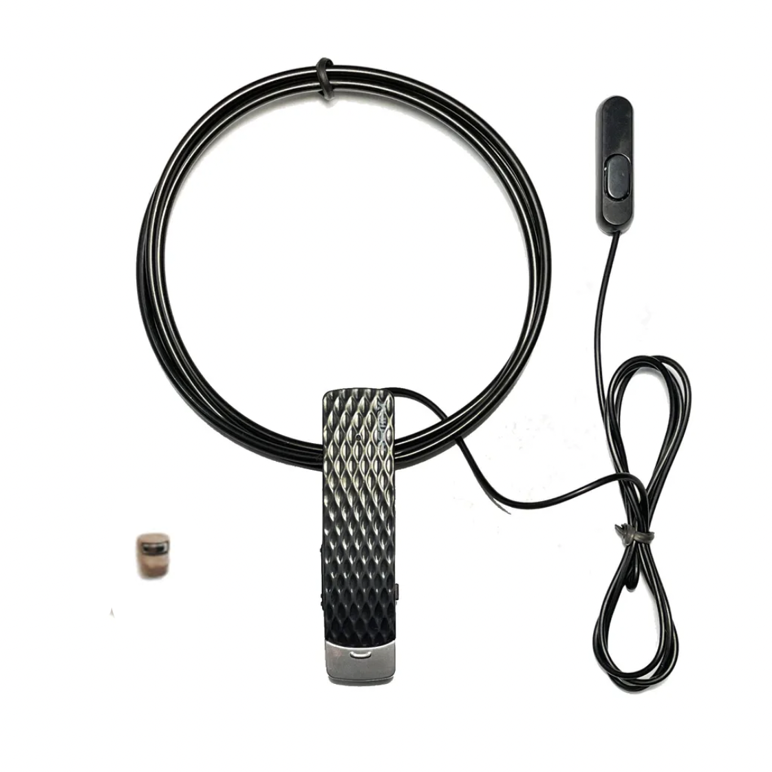 Гарнитура подключается к телефону с помощью блутуз, что позволяет отдалять телефон на расстояние до 10 м. Это поможет, если при входе в помещении потребуется сдать телефон. Гарнитура одевается на шею и прячется под одеждой. Благодаря небольшим размерам и беспроводному подключению, она не создает дискомфорта при движениях. Питание гарнитуры происходит от встроенного аккумулятора. Благодаря кнопке навигации есть возможность принимать/сбрасывать звонок и набирать на последний номер. Недостатком этой модели есть встроенный микрофон на гарнитуре, который немного теряет чувствительность под одеждой. Но если нужно сказать собеседнику всего несколько слов или подать знак, а дальше писать под диктовку – встроенного микрофона вполне достаточно. Время работы аккумулятора гарнитуры не больше 7 часов разговора.